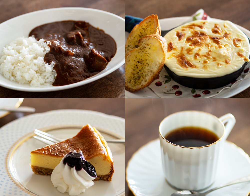 メニューはカレーとグラタン、デザート、コーヒーは四国の焙煎士の豆で浅煎り・深煎りの2種。